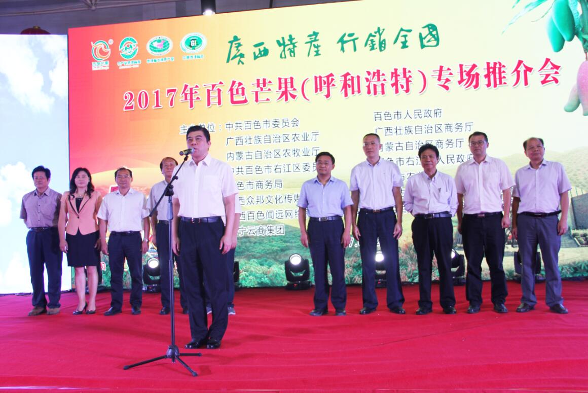 7月27日上午,由中共百色市委員會(huì )、百色市人民政府、內蒙古自治區農牧業(yè)廳、內蒙古自治區商務(wù)廳、廣西壯族自治區商務(wù)廳、廣西壯族自治區農業(yè)廳主辦的2017年百色芒果專(zhuān)場(chǎng)推介會(huì )在協(xié)會(huì )會(huì )員單位、內蒙古食全食美集團美通食品批發(fā)市場(chǎng)內蒙古農畜產(chǎn)品展銷(xiāo)大廳舉行。百色市委副書(shū)記、統戰部部長(cháng)楊春庭在推介會(huì )上宣布活動(dòng)正式啟動(dòng),內蒙古自治區農牧業(yè)廳副廳長(cháng)劉永志、百色市政協(xié)副主席韋曉東等領(lǐng)導出席推介會(huì ),有關(guān)特邀嘉賓、百色市、縣有關(guān)部門(mén)代表、內蒙古自治區有關(guān)部門(mén)、呼和浩特市有關(guān)部門(mén)負責人、客商代表、新聞媒體等參加會(huì )議。