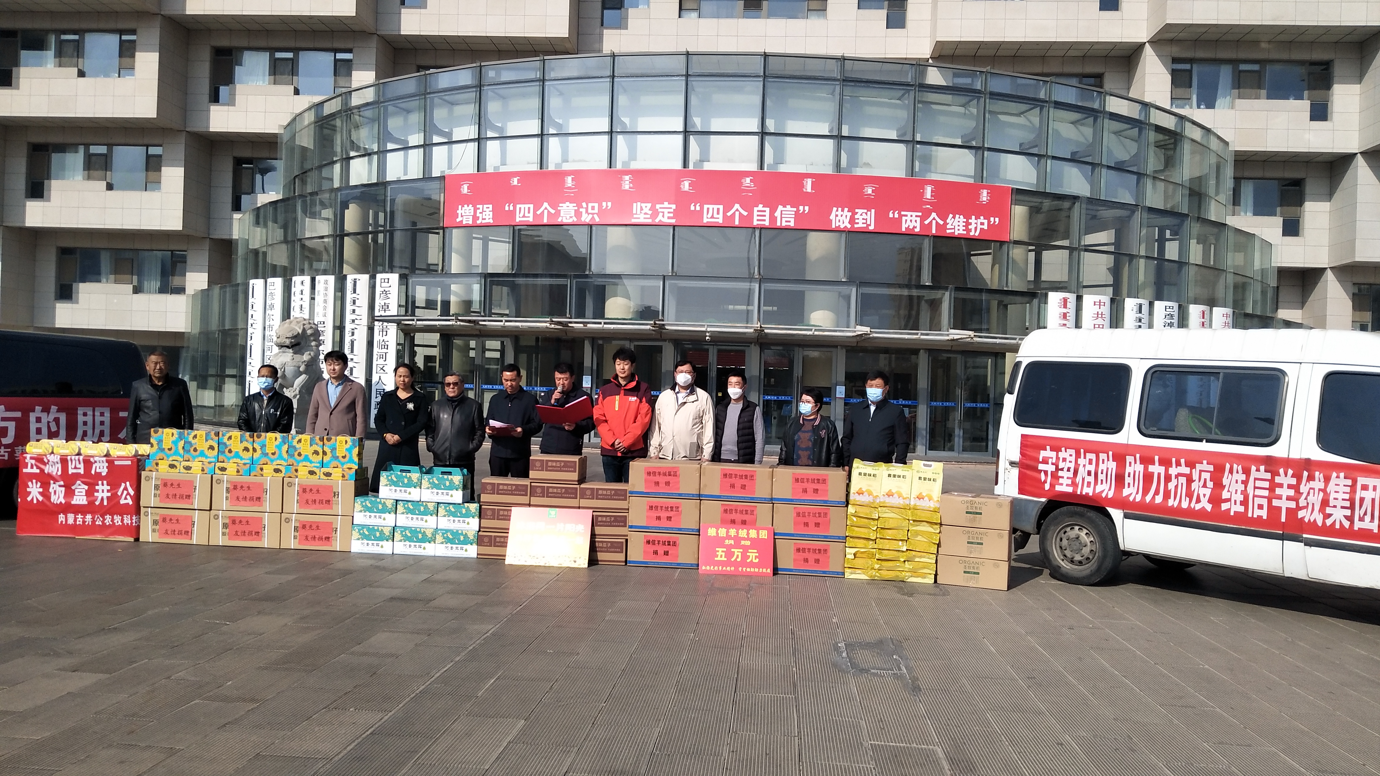 11月5日中午,維信羊絨集團等7家會(huì )員單位向巴彥淖爾市臨河區抗疫捐贈物資,捐贈儀式在臨河區政府辦公樓前舉行,區委副書(shū)記、政法委書(shū)記陳海維參加活動(dòng)并講話(huà),對愛(ài)心企業(yè)的高尚情操給與了高度評價(jià),區政協(xié)副主席劉浩主持了捐贈儀式。