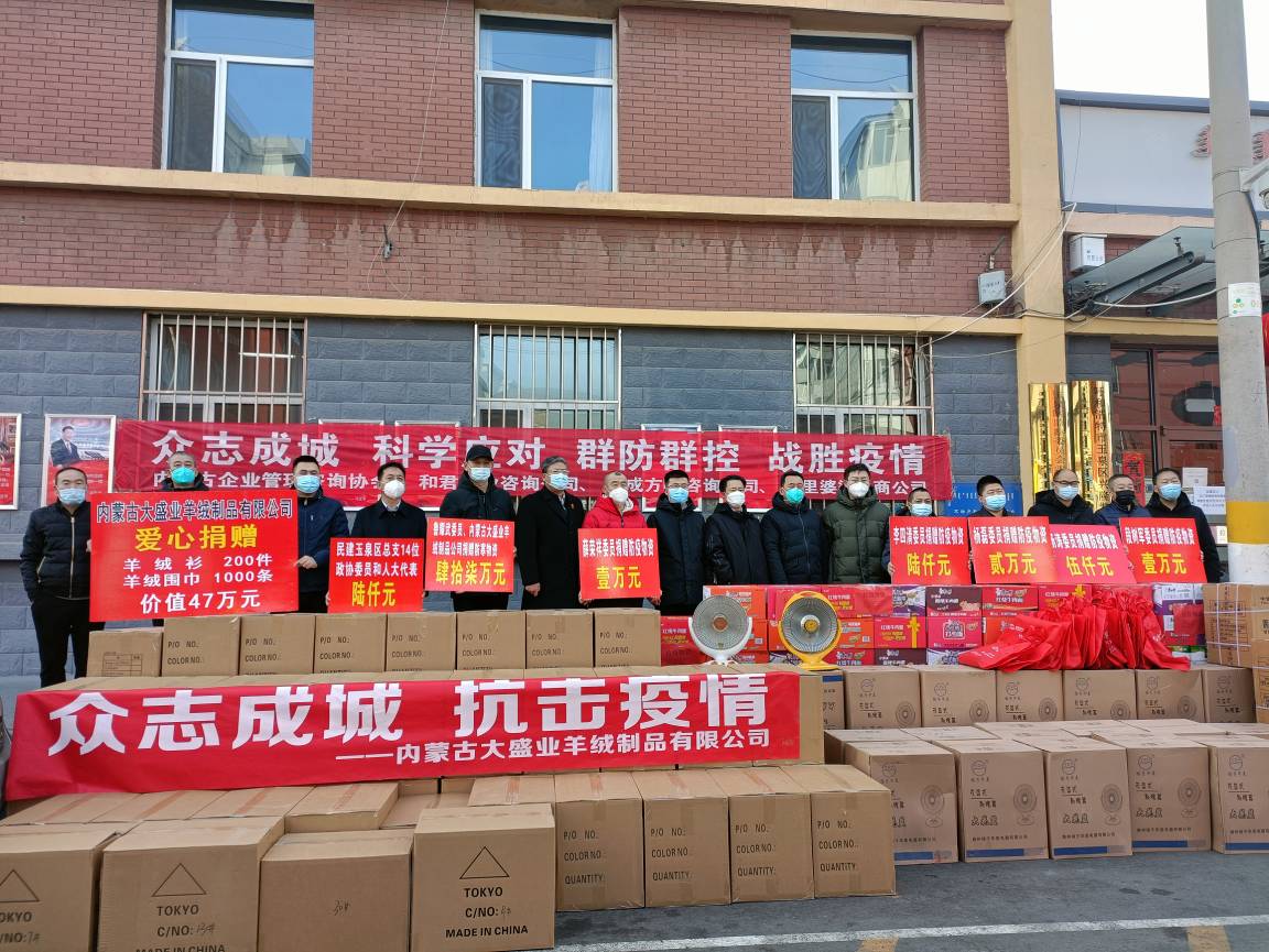 6、副會(huì )長(cháng)單位-內蒙古大盛業(yè)羊絨制品有限公司:2月21日,將價(jià)值47萬(wàn)元的200件羊絨衫、1000條羊絨圍巾捐贈給玉泉區紅十字會(huì ),為抗疫人員送去溫暖。