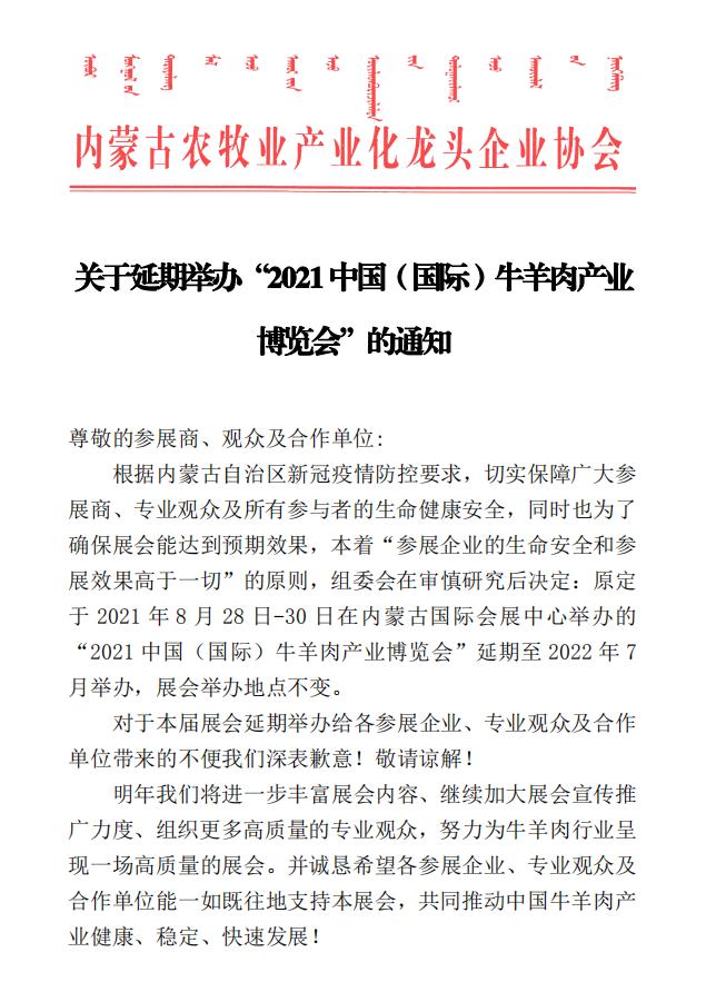 關(guān)于延期舉辦“2021中國(國際)牛羊肉產(chǎn)業(yè)博覽會(huì )”的通知
