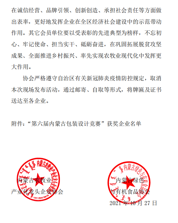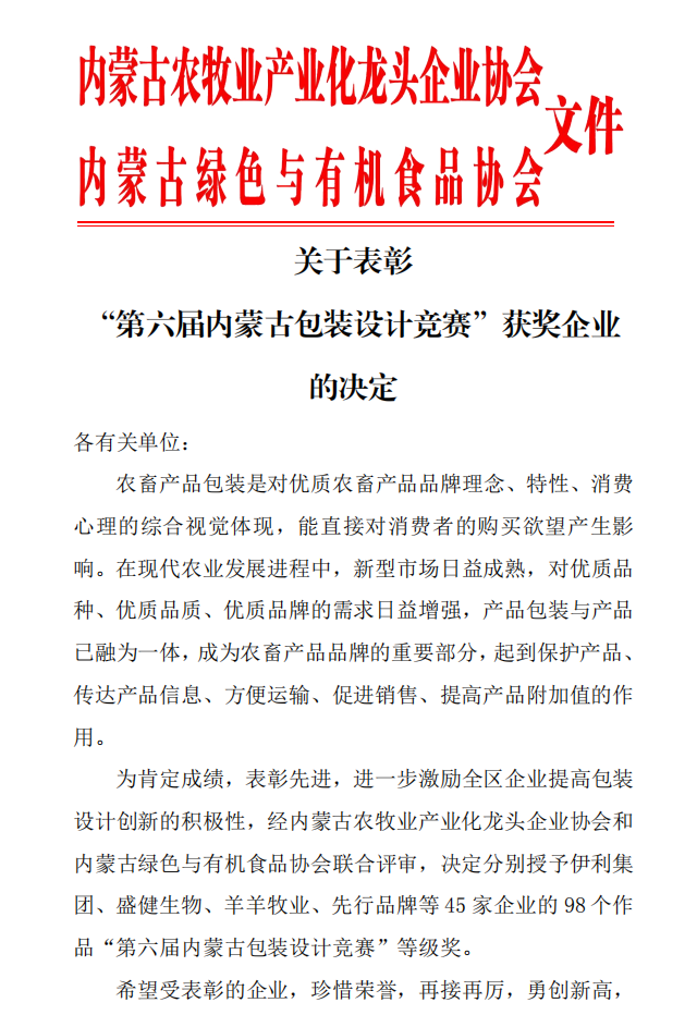 關(guān)于表彰 “第六屆內蒙古包裝設計競賽”獲獎企業(yè) 的決定