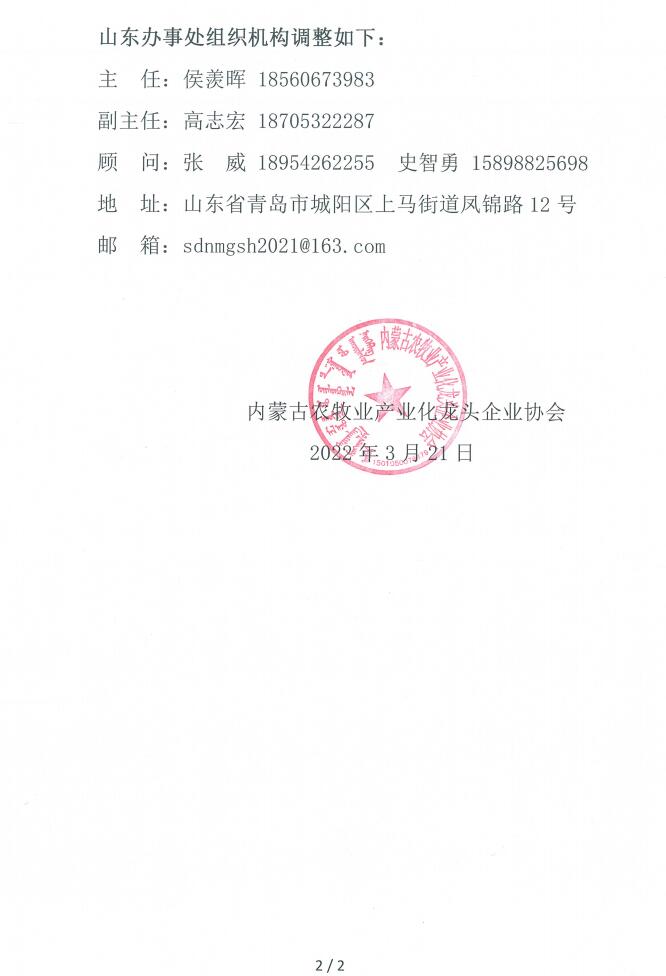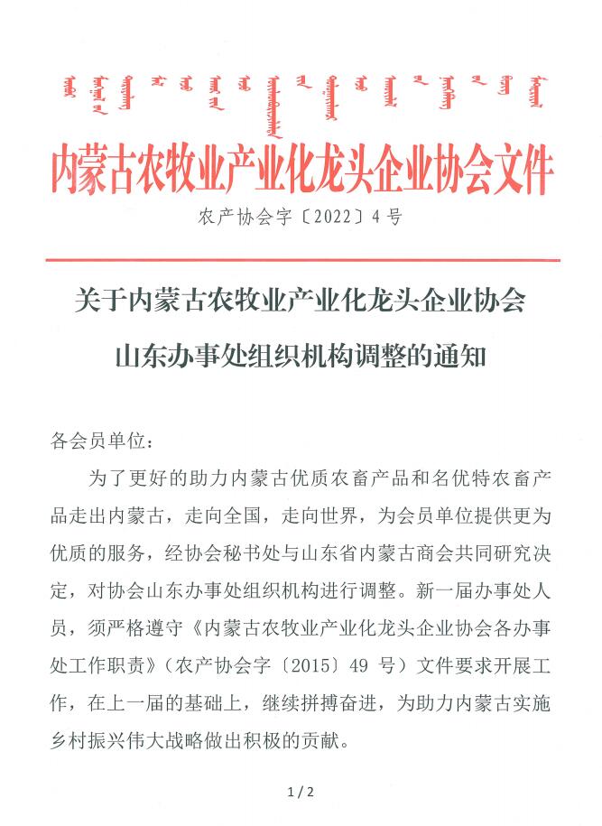 關(guān)于內蒙古農牧業(yè)產(chǎn)業(yè)化龍頭企業(yè)協(xié)會(huì )山東辦事處組織機構調整的通知