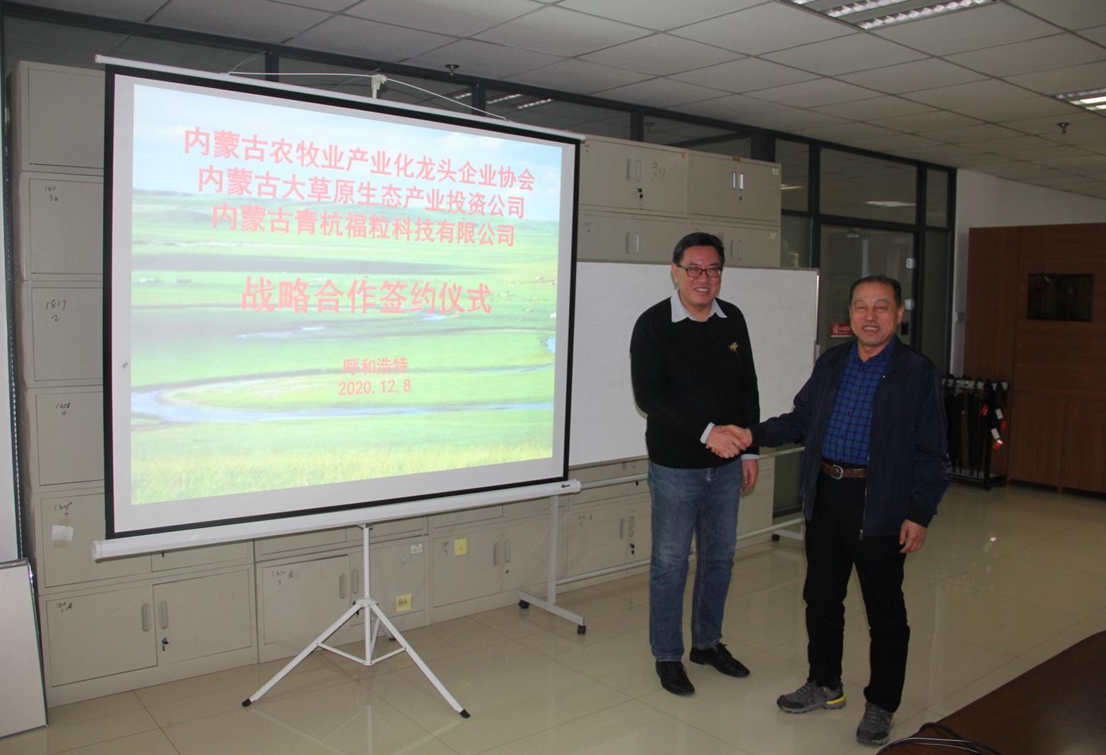 2020年12月8日,內蒙古農牧業(yè)產(chǎn)業(yè)化龍頭企業(yè)協(xié)會(huì )執行會(huì )長(cháng)林永亮一行到內蒙古青杭福??萍加邢薰窘涣骺疾?,并與大草原生態(tài)產(chǎn)業(yè)投資有限公司董事長(cháng)李剛簽署戰略合作協(xié)議。