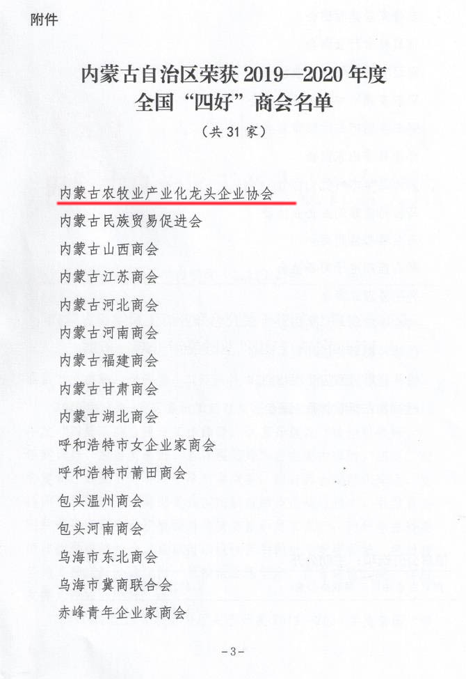 標題:喜報!內蒙古農牧業(yè)產(chǎn)業(yè)化龍頭企業(yè)協(xié)會(huì )榮獲全國“四好”商會(huì )榮譽(yù)稱(chēng)號