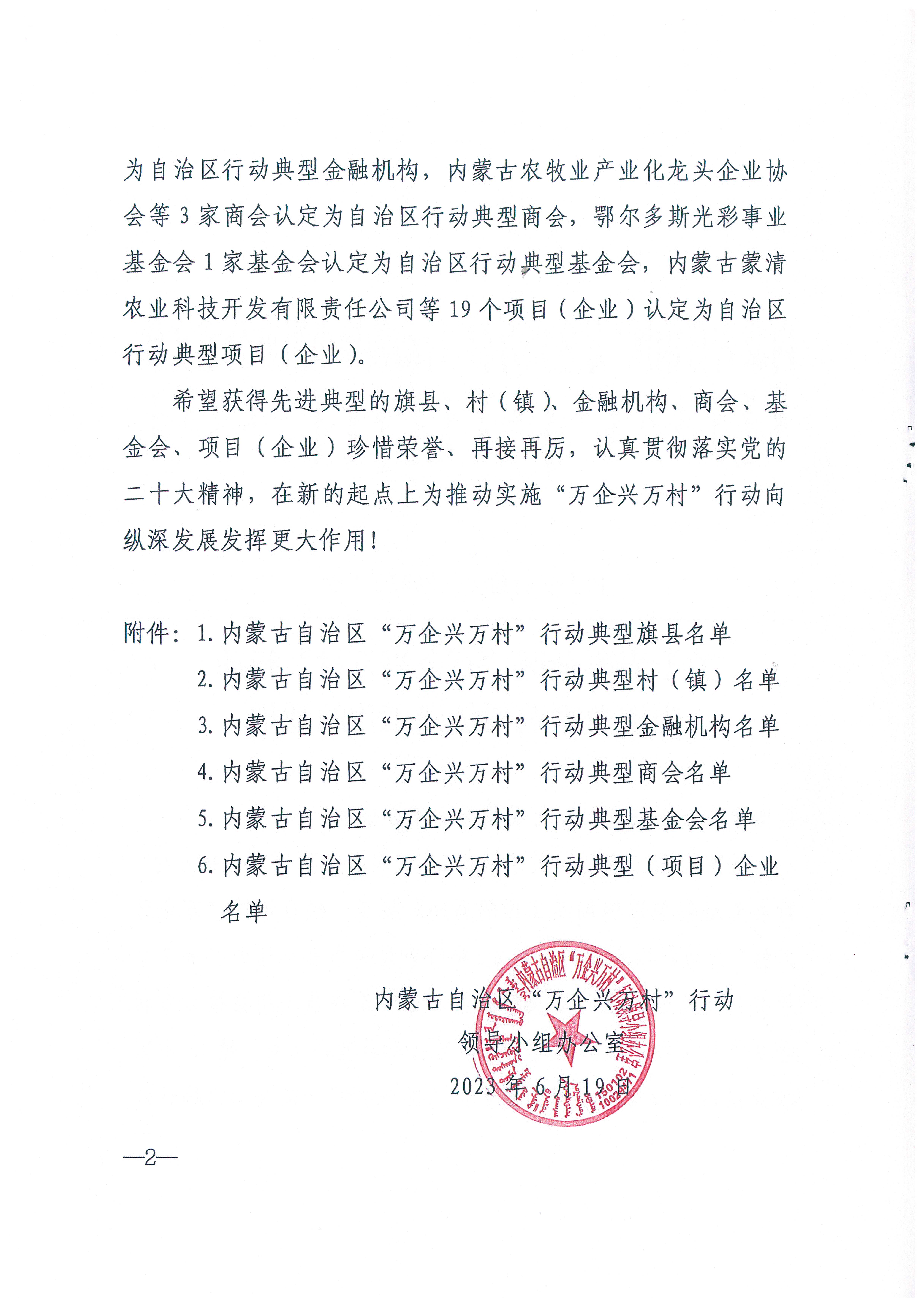 按照全國工商聯(lián)《關(guān)于做好 2023 年度全國“萬(wàn)企興萬(wàn)村行動(dòng)先進(jìn)典型選樹(shù)創(chuàng )建工作的通知》要求,經(jīng)自治區“萬(wàn)企興萬(wàn)村”行動(dòng)領(lǐng)導小組研究決定,將呼和浩特市和林格爾縣等 7個(gè)旗縣認定為自治區行動(dòng)典型旗縣,呼和浩特市武川縣福如東村等8個(gè)村(鄉、鎮)認定為自治區行動(dòng)典型村 (鄉、鎮),中國農業(yè)銀行股份有限公司內蒙古自治區分行等 3 家金融機構認定為自治區行動(dòng)典型金融機構,內蒙古農牧業(yè)產(chǎn)業(yè)化龍頭企業(yè)協(xié)會(huì )等 3 家商會(huì )認定為自治區行動(dòng)典型商會(huì ),鄂爾多斯光彩事業(yè)基金會(huì ) 1家基金會(huì )認定為自治區行動(dòng)典型基金會(huì ),內蒙古蒙清農業(yè)科技開(kāi)發(fā)有限責任公司等 19 個(gè)項目(企業(yè))認定為自治區行動(dòng)典型項目(企業(yè))。