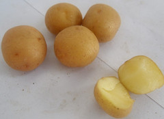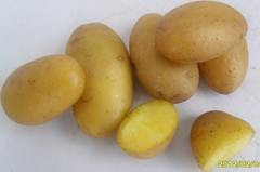 FAVORITA(費烏瑞它)1981年由國家農業(yè)部種子局從荷蘭引入,山東省農業(yè)科學(xué)院蔬菜花卉所引入山東栽培,取名“魯引1號”,1989年天津市農業(yè)科學(xué)院蔬菜花卉所引入,取名“津引8號”,又名“荷蘭薯”、“荷蘭七號”、“荷蘭15”,為我國主栽早熟品種之一,該品種出苗后60—70天即可收獲。 [特征特性]該品種早熟,株型直立,株高約60cm左右,莖桿粗壯,分枝少,葉片肥大,葉緣波狀,花淡紫色;結薯集中,薯塊膨大迅速,長(cháng)橢圓形,芽眼淺,黃皮黃肉,表皮光滑,食味好,適合加工和出口創(chuàng )匯,在香港及東南亞各國極為暢銷(xiāo);抗馬鈴薯Y病毒,對A病毒免疫;淀粉12.4%—14%,還原糖0.03%。植株易感晚疫病。塊莖感晚疫病和環(huán)腐病。輕感青枯病、退化快。產(chǎn)量高,畝產(chǎn)2000kg,高產(chǎn)可達3000kg以上。 [適宜范圍]該品種適宜性較廣,黑龍、遼寧、內蒙古、河北、北京、山東、江蘇、廣東、廣西、貴州、四川等地均有種植,是適宜出口的品種。